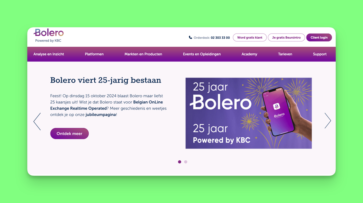 First up is Bolero which is among Belgium's oldest online brokers, starting in 1999. Its name, Belgian OnLine Exchange Realtime Operated, highlights its aim to serve Belgian investors. Owned by KBC Bank, Bolero is open to everyone in Belgium, not just KBC customers.