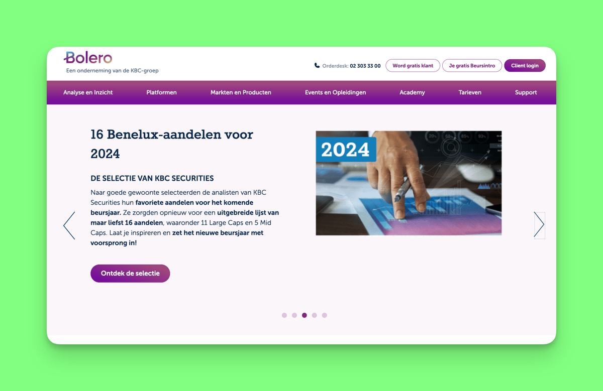 Bolero is one of the first online brokers in Belgium and launched in 1999. The name Bolero stands for Belgian OnLine Exchange Realtime Operated. It's owned and run by KBC Bank and allows Belgians to invest in many different types of assets. Note that you don't have to be a KBC customer to use Bolero. Bolero has a wide range of ETFs to choose from and continues to be one of the most popular brokers in Belgium although it also charges some of the highest fees.