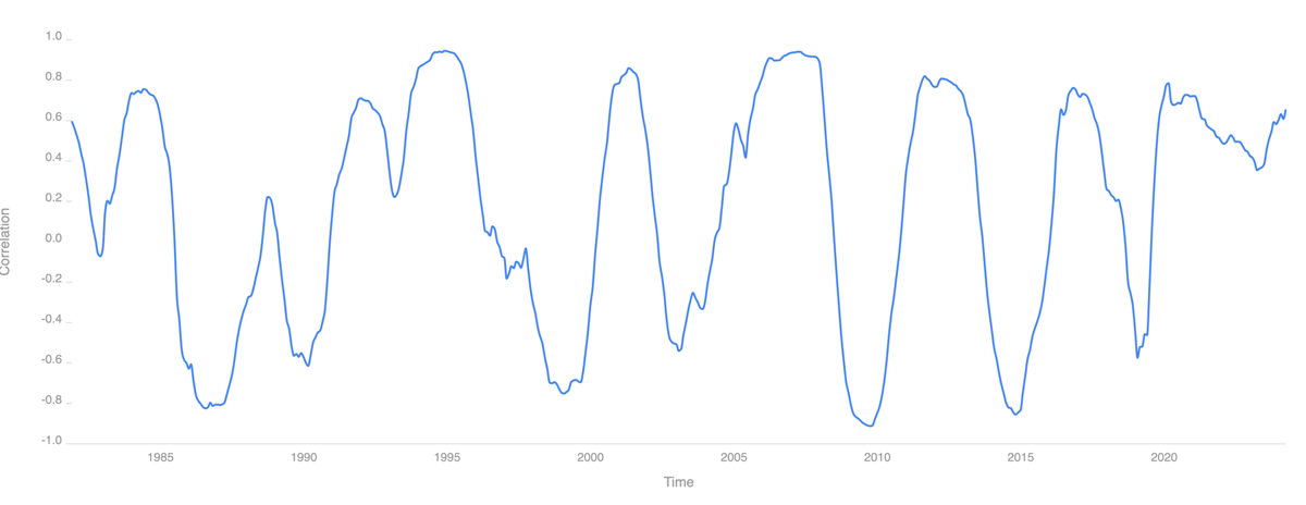 The chart below shows the correlation between gold and the MSCI World index, a diversified index of over 1,600 global stocks. While there are periods with a high correlation, there are also many periods where the correlation is close to -1, indicating that gold and the index move in opposite direction.