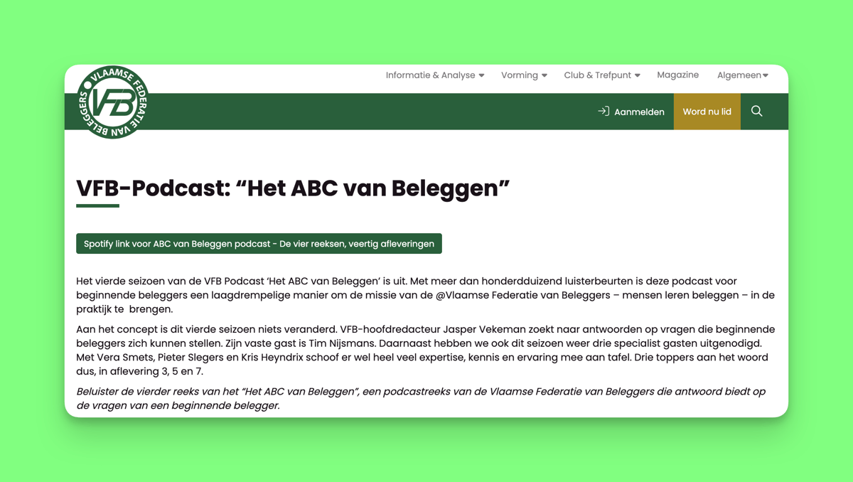 Produced by the Vlaamse Federatie van Beleggers (VFB), Het ABC van Beleggen is a must-listen podcast for beginners. Hosted by Jasper Vekeman and Tim Nijsmans, this series explains the foundational principles of investing, making it perfect for those who want to build a solid understanding before diving into the markets.