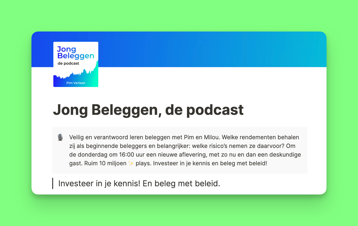 If you're just starting with investing, Jong Beleggen, de podcast is a solid resource. Pim Verlaan and Milou Brand host this podcast. They share their personal investment journeys. It offers a real and relatable view of being a young investor.