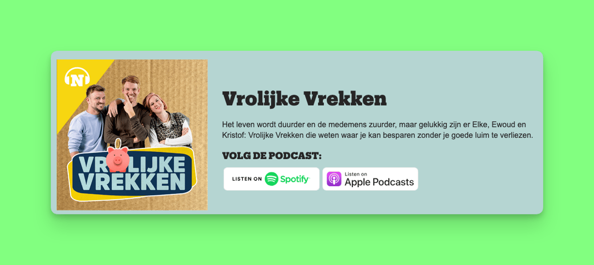 Vrolijke Vrekken is a Belgian podcast in Dutch. It teaches smart ways to save and manage money while enjoying life. Hosts Kristof Bogaerts, Ewoud Huysmans, and Elke Gyselen are journalists at Het Nieuwsblad. They share their experiences and insights with a fun and humorous touch. They discuss practical saving tips, useful tricks, and strategies to maximise your budget while maintaining a generous attitude. The goal is to help people live more financially aware lives and get a better grip on their spending.