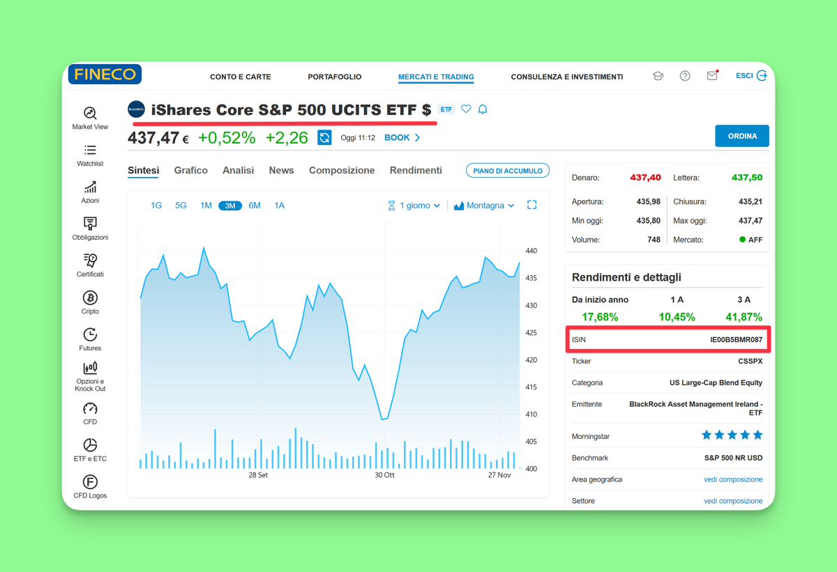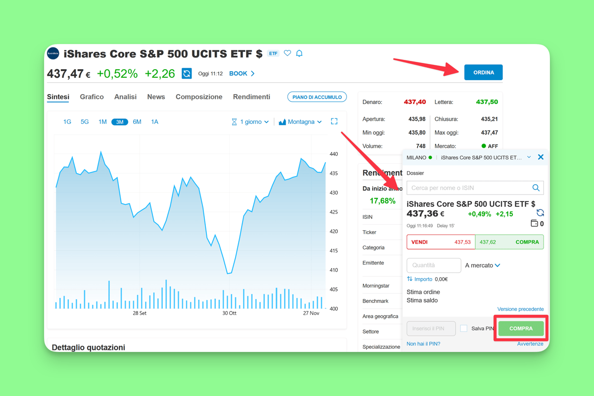 ETFs are traded on exchanges. So to buy an ETF, you will have to turn to a broker. To make this concrete for you, we'll buy the S&P 500 ETF using the broker Fineco.