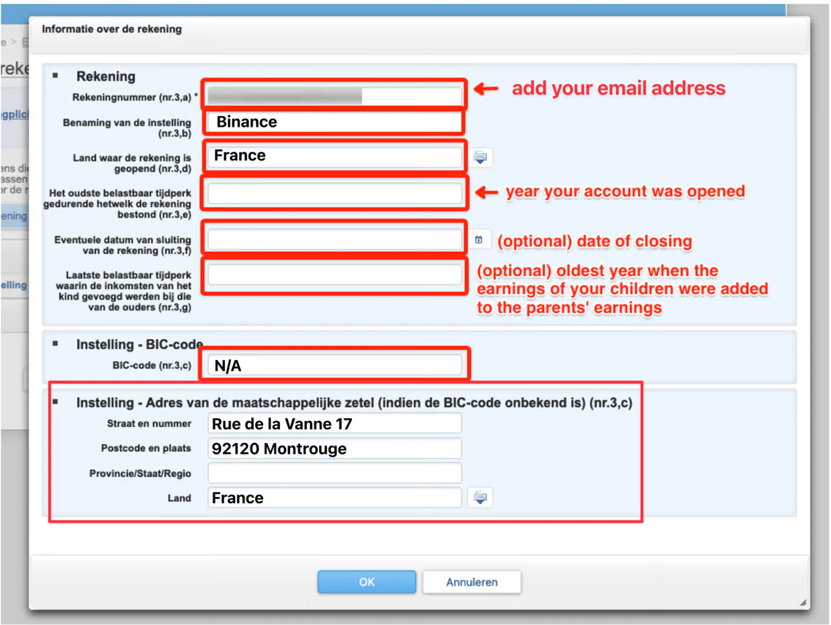- Land waar de rekening is geopend (nr.3,d): Select the country associated with the Binance platform. Binance operates through several entities around the world, but since Binance has a registered entity in France for the EU, you can indicate ‘France’ as the country.