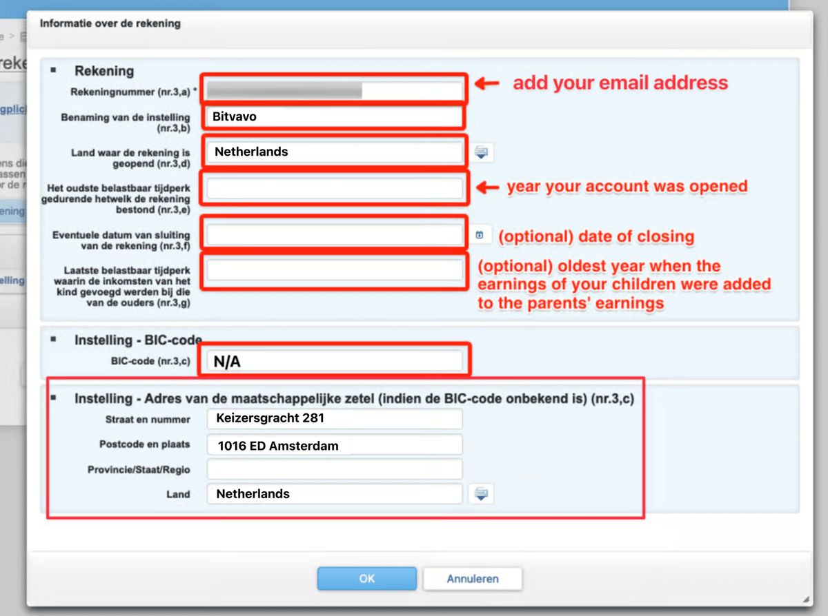 - Rekeningnummer (nr.3,a): Enter a reference that identifies your Bitvavo account. Bitvavo is not a banking institution and doesn’t provide an IBAN or traditional account number. It's best to use the email address associated with your Bitvavo account as the account identifier. Your login email is unique to your Bitvavo account.