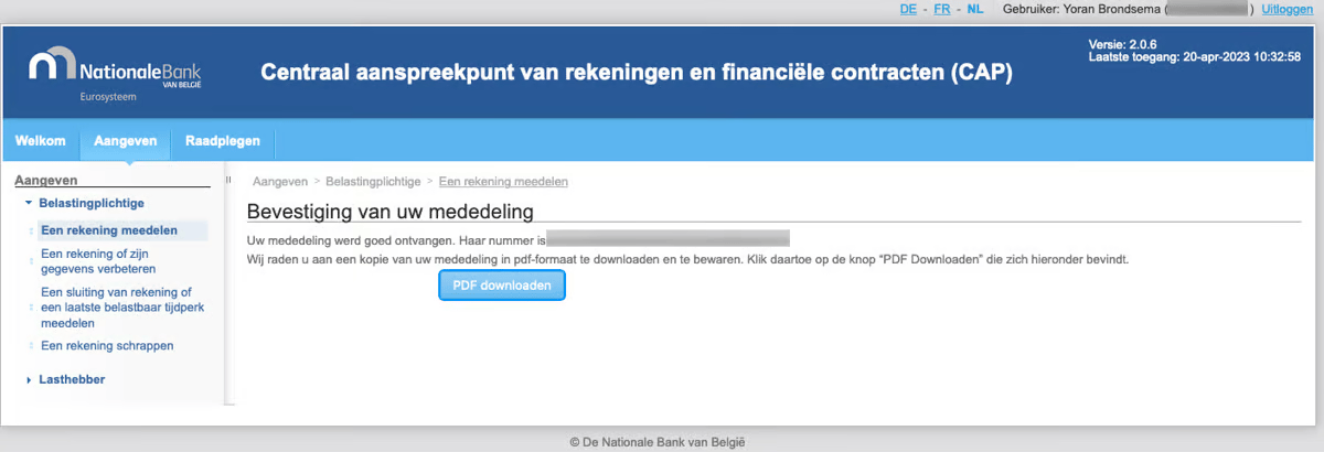 - Check the box "Zijn de wettelijk bepaalde gegevens over de rekening bij het Centraal Aanspreekpunt bij de Nationale Bank van België gemeld?" or "Les données relatives au compte, qui sont prévues par la loi, ont-elles été communiquées au Point de Contact Central de la Banque nationale de Belgique ?"