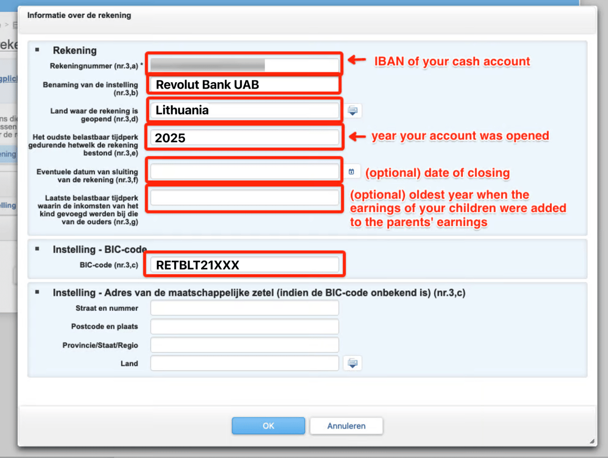 - Rekeningnummer (nr.3,a): the IBAN of your Revolut bank account. You can find it in the Settings section of your Revolut app.