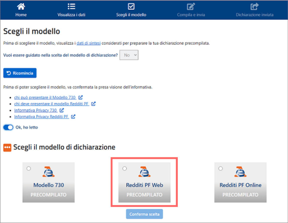 - Click on "Modello Redditi PF Web Precompilato"