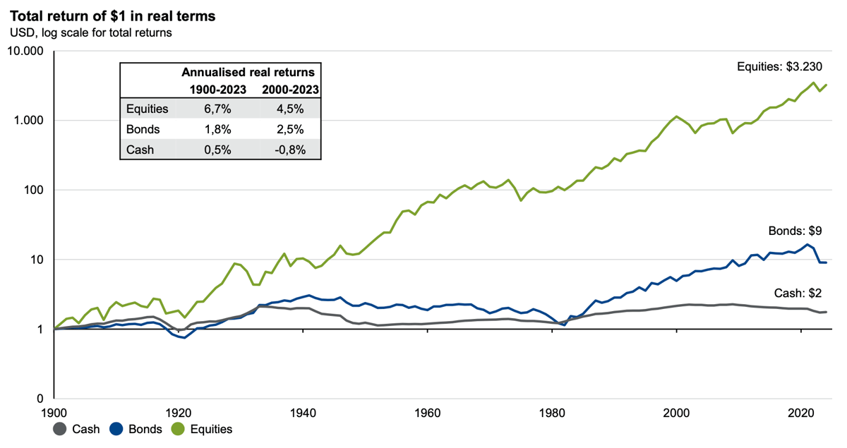 The performance of equities vs bonds vs cash between 1900 and 2023 (from JP Morgan)