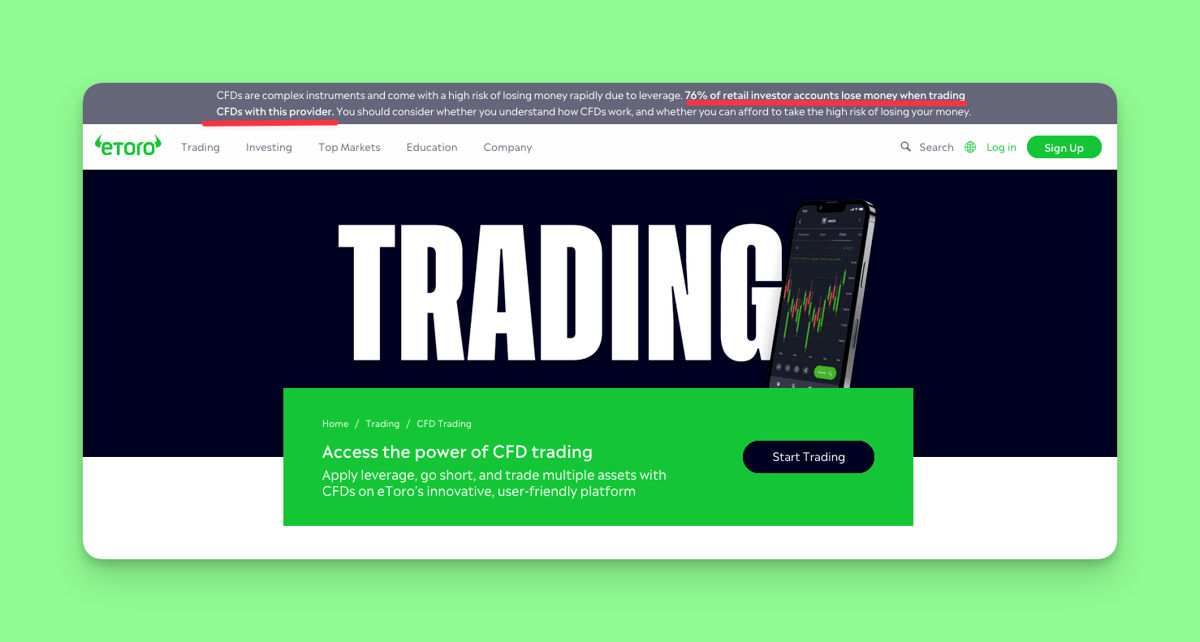 Because of these reasons, most investors lose money when trading CFDs. As eToro says themselves on their website, 76% of eToro customers lose money when trading CFDs.