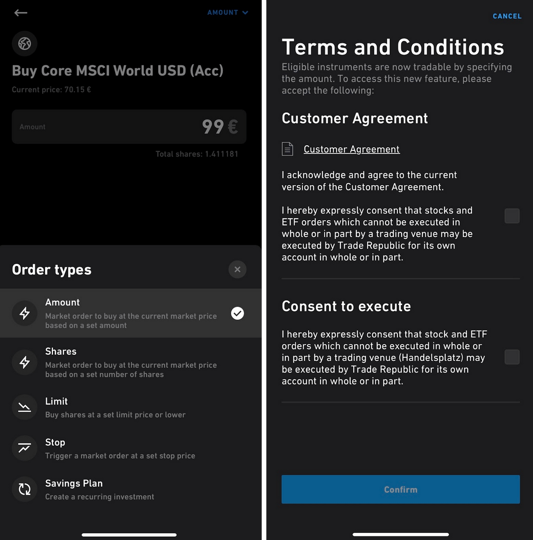 Once you’re ready, select the order type. Beware that there are different options such as "Limit" or "Stop" that are for more experienced traders. The easiest option is to choose “Amount” where you can select how much money you wish to invest. The app will calculate the part of the share it will need to buy.