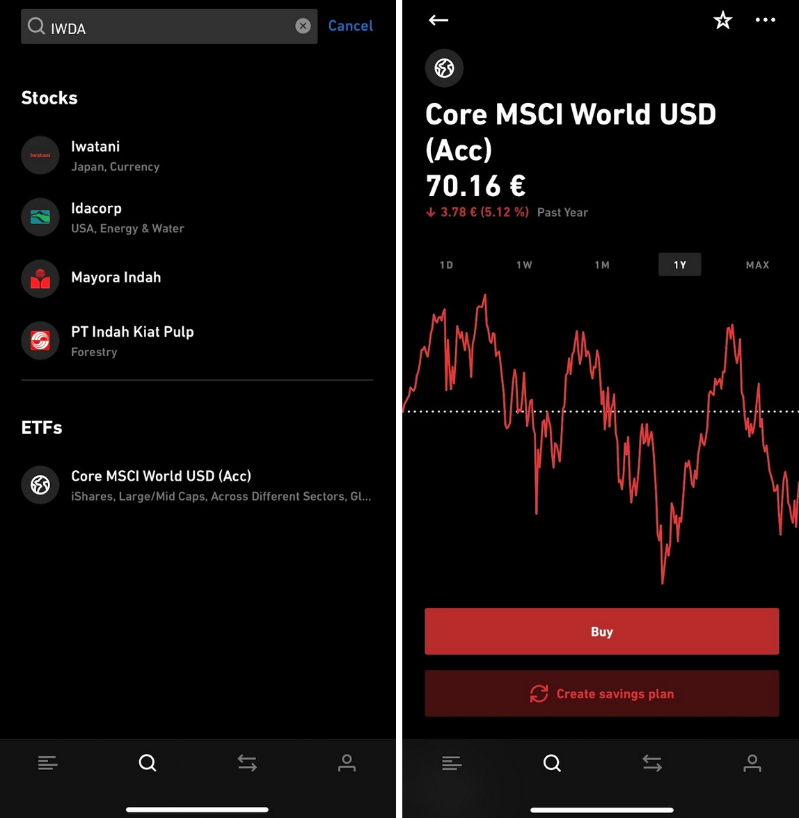 To find your ETF, start by clicking on the magnifying glass at the bottom of the app and type in “IWDA”. You’ll then see “Stocks” and “ETFs” pop up below. You’ll find that the “Core MSCI World USD (Acc)” is what we’re looking for.
