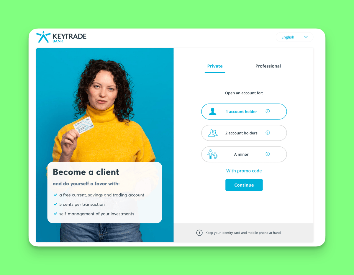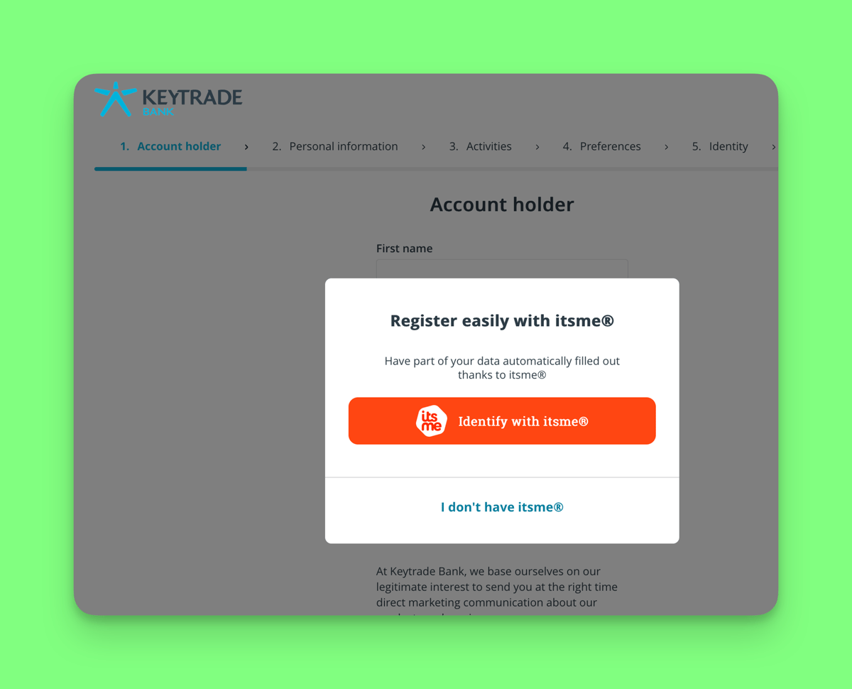 You can create a new Keytrade account using itsme. You must create a Keytrade account in order to set up a Keyprivate plan. Using itsme speeds up the process of creating an account, as the old way was very slow. It even says that manual verification can take between 5 working days:
