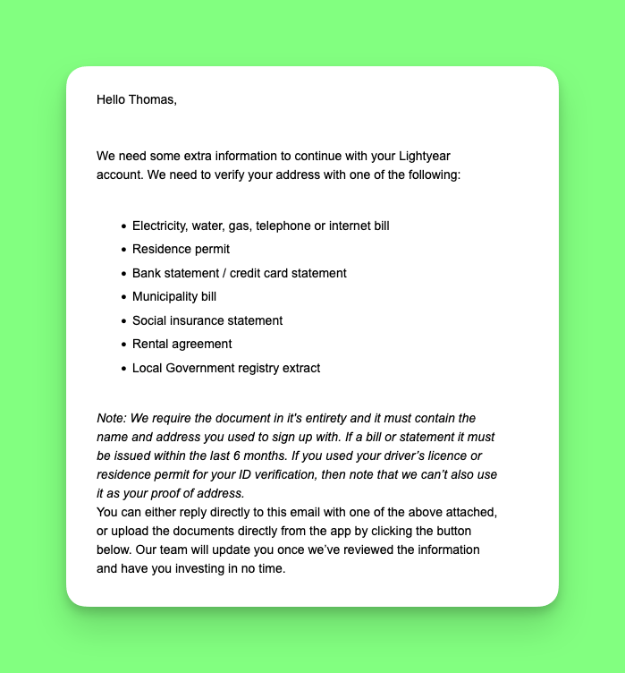 Note that if you're registering from Belgium, Lightyear will most likely email you asking for a verification of details and a proof of address: