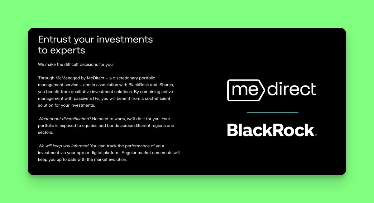 With MeManaged, MeDirect claims to make investing as simple as saving money. Choose a portfolio, deposit €5,000, and their experts will manage your investments for you. No need to worry about picking stocks or rebalancing your portfolio.