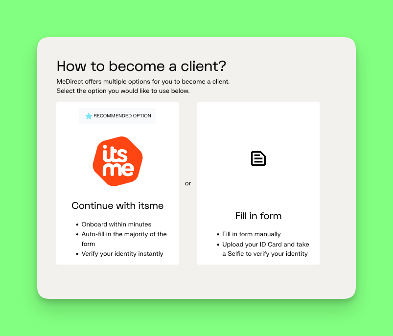 You can create a new MeManaged account using itsme. You must create a MeDirect Bank account in order to set up a MeManaged plan. Using itsme speeds up the process of creating an account, as the old way was very slow. It even says that manual verification can take longer.