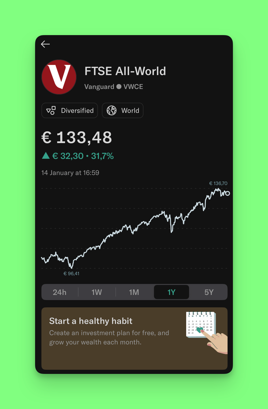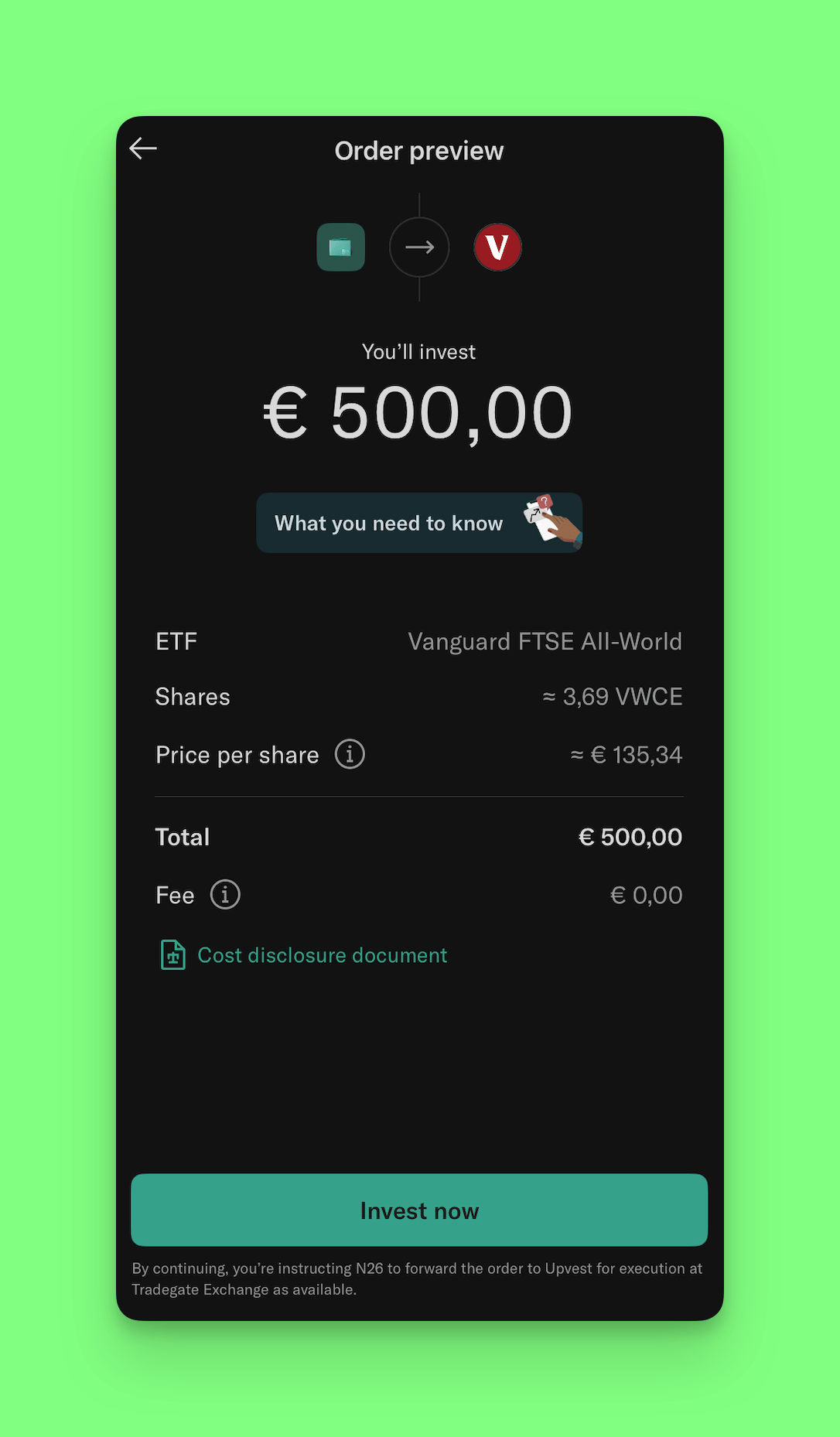 A popular investment strategy is euro-cost averaging, where you invest periodically instead of investing large lump sums in one go. You invest at fixed times, for instance every month, regardless of how the markets are performing. Most people are paid monthly, so it makes sense for their investments to follow the same pattern. Fortunately N26 offers the option to buy fractions of ETFs.