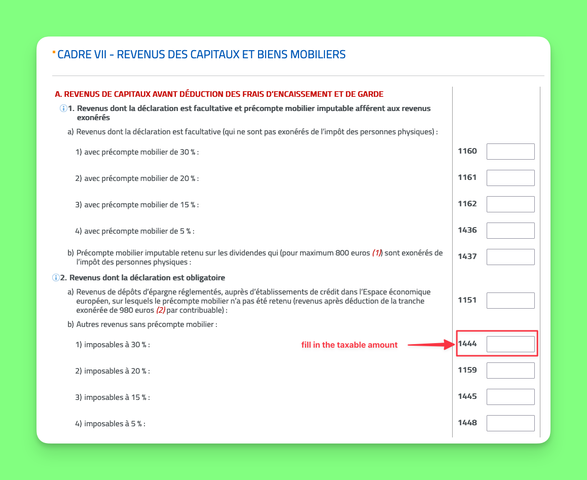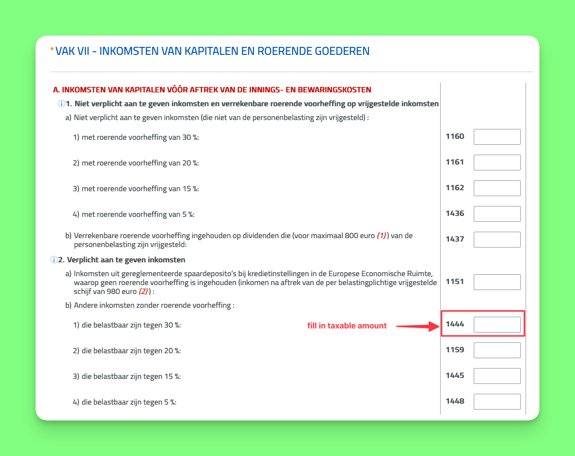 Fortunately, the declaration is a lot easier than the calculation! You simply need to add the capital gains coming from bonds in code 1444 of the box VII (Income from capital and movable property) of the tax declaration. Be careful, do not put the amount of the Reynders tax itself, but the whole capital gain. You'll end up paying 30% of the amount that you declare in taxes. So suppose you bought a bond ETF at €200 and sold at €300. You made a €100 profit. You would fill in €100 in code 1444 (and not the Reynders tax of €30).