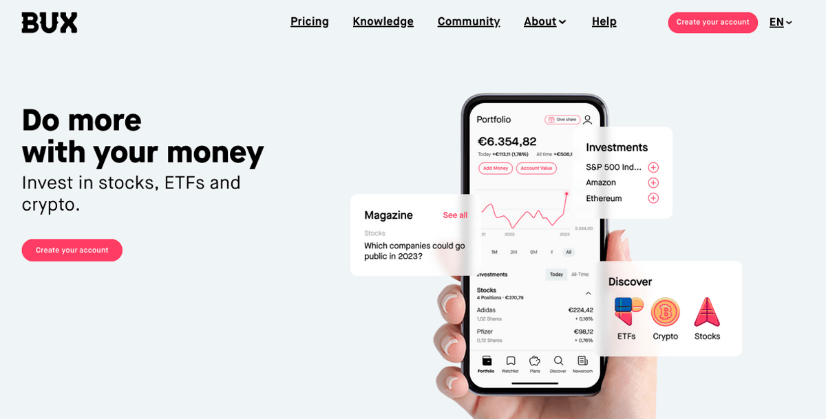 BUX launched in 2014. It's a Dutch neo-broker app that allows you to invest in the companies you love. One big benefit which makes it similar to Robinhood is that they offer fractional shares so you can buy slices of your favourite companies. The major downside is that BUX has a subscription model. You have to pay €2.99 per month as a "service fee" to use the app. This makes it quite expensive, because you'll also have to pay separately for trades.